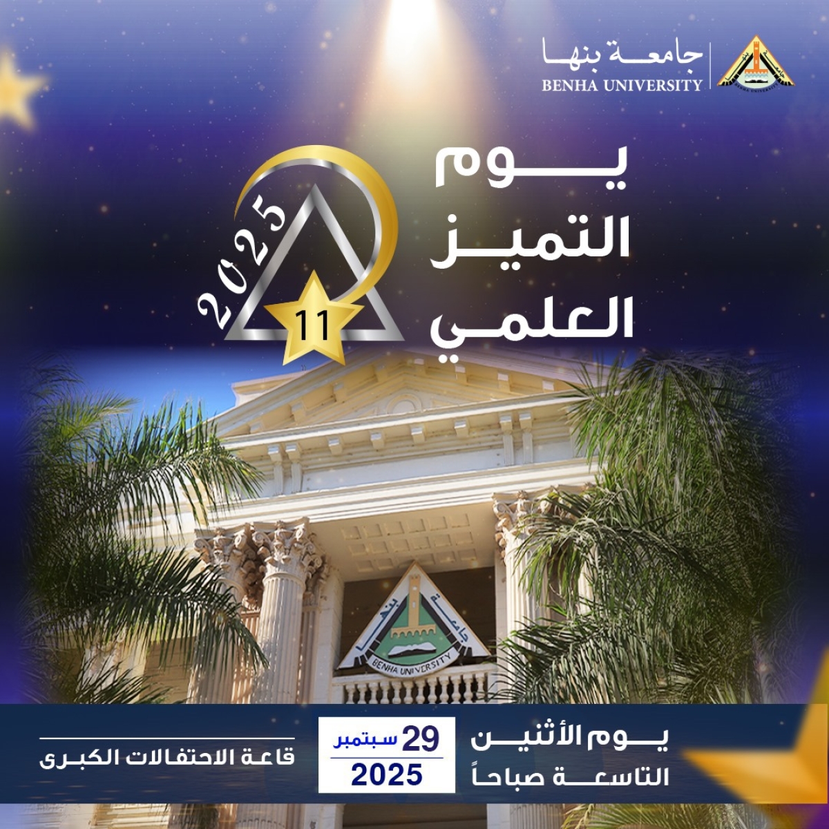 صرحت الدكتورة جيهان عبدالهادي نائب رئيس جامعة بنها للدراسات العليا والبحوث انه في إطار سياسة الجامعة لدعم وتحفيز المتميزين ينظم قطاع الدراسات العليا تحت رعاية الاستاذ الدكتور ناصر الجيزاوي رئيس الجامعة يوم التميز العلمي بدورته الحادية عشر، وذلك يوم الإثنين الموافق 29 سبتمبر 2025، بقاعة الاحتفالات الكبرى بكلية التجارة.